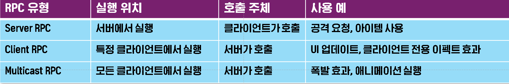 Server, Client, Multicast 3가지 유형이 존재하며, 실행 위치가 다르며, 즉각적인 동작(공격, 점프, 채팅 메세지 등)이 필요할 때 사용하면 좋다.